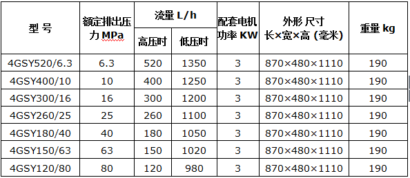 上海楷陽(yáng)泵業(yè)生產(chǎn)的4GSY型四缸大流量系列電動(dòng)試壓泵主要型號(hào)參數(shù)如下: