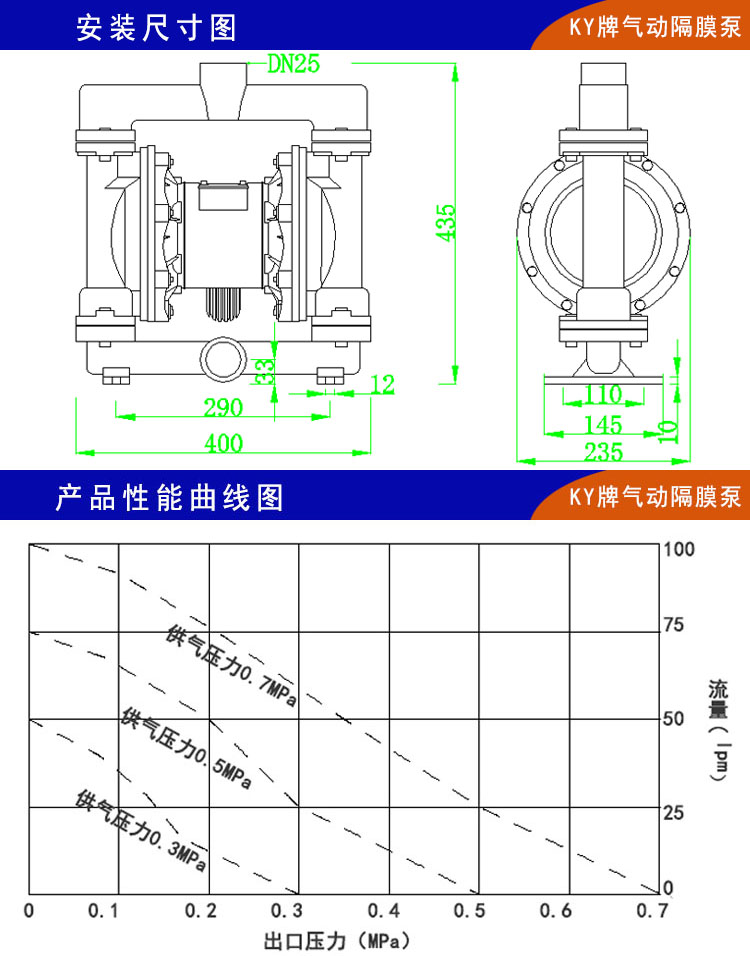 8、K型QBY氣動隔膜泵揚程、流量可通過氣閥開度實現(xiàn)無級調節(jié)(氣壓調節(jié)在2-7bar之間)