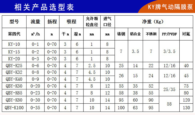 10、K型QBY氣動隔膜泵不需灌引水,吸程高達7米,揚程達60米,出口壓力≧6bar