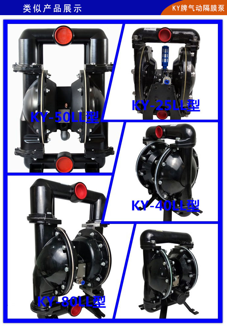 9、KY牌鋁合金氣動(dòng)隔膜泵整體構(gòu)造上更加優(yōu)化,泵腔和主管路都有明顯加強(qiáng),自吸功能和流量揚(yáng)程都有很大改善。