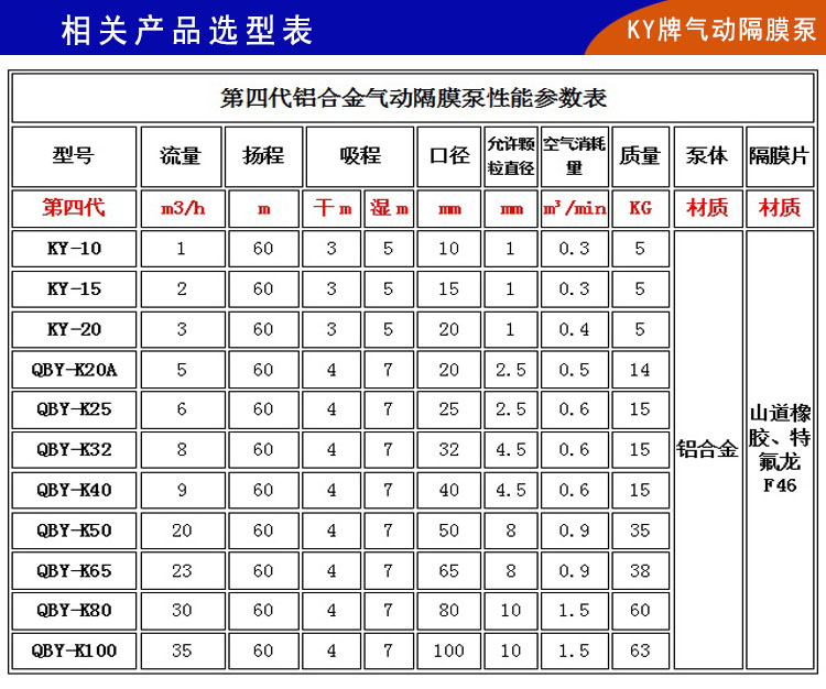 楷陽氣動雙隔膜泵鑄件全部數控加工,主膜片采用特氟龍F46和進口特氟龍,副膜片使用山道橡膠和彈性橡膠,替代了常用的四氟和普通橡膠等劣質易損件;密封球和密封座采用特氟龍F4和山道橡膠;從而大大增加了氣動隔膜泵易損件的使用壽命。QBY-K鋁合金氣動雙隔膜泵配氣裝置內置一體化,做到了真正的不卡氣、無死機,外觀更加美觀大方;空氣利用率大大提高,自吸功能和流量揚程都有很大改善。