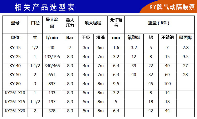 9、KY牌鋁合金氣動隔膜泵整體構造上更加優化,泵腔和主管路都有明顯加強,自吸功能和流量揚程都有很大改善。